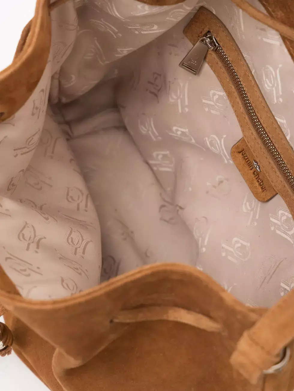 Bucket Follow confeccionado en gamuza, con ajuste mediante tientos de cuero con terminales metálicas. Lleva logo en relieve en el frente y bolsillo interior con cierre. Un diseño moderno y funcional con textura sofisticada.